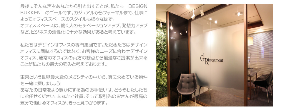 私たちGLRの強み厳選された質の高いオフィスを多数取り扱い デザインオフィスを作り出すことができる 経営者様の価値観にあう物件をご提案できるオフィス移転のトータルコーディネートをお手伝いできます経営者の思い描く世界観あぶれるオフィスを実現いたします。
